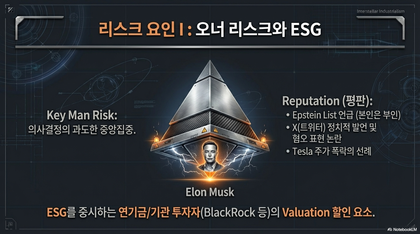 지배구조와 ESG 평판: 머스크 1인에게 집중된 의사결정 구조는 치명적인 약점입니다. 최근 거론된 '앱스타인 문건' 연루 의혹(머스크는 강하게 부인)과 같은 개인적 이슈는 블랙록 등 대형 자산운용사의 ESG 감사를 자극하여 기업 가치 산정에 부정적인 영향을 줄 수 있습니다. 한 기업의 평판 타격이 제국 전체의 밸류에이션 하락(Hair-cut)으로 이어지는 구조적 위험이 상존하는 것입니다.