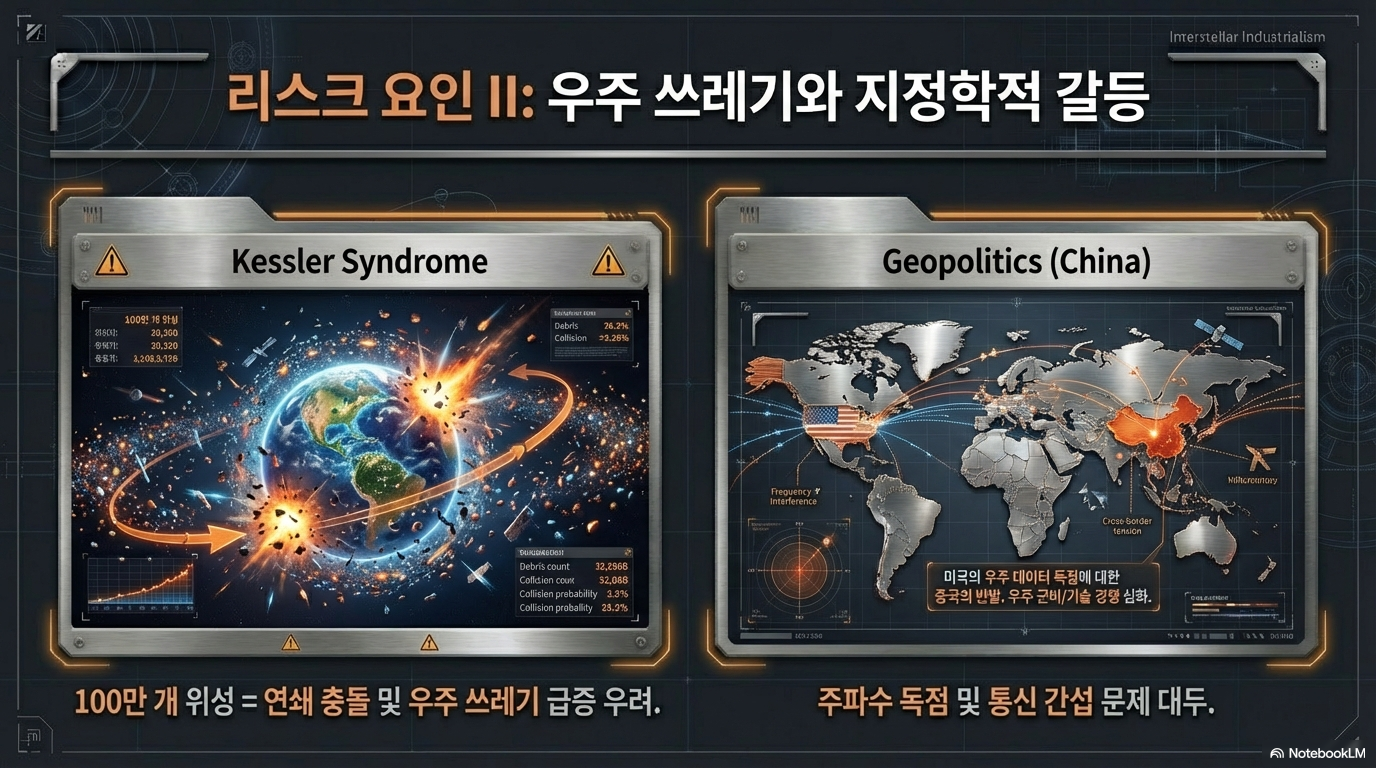 우주 독점과 패권 경쟁: 최근 스페이스X는 100만 기의 위성 발사 허가를 신청했습니다. 이는 인류 역사상 발사된 전체 위성 수의 수십 배에 달하는 수치로, 사실상 적도 궤도를 독점하겠다는 선언입니다. 이는 우주 쓰레기 문제뿐만 아니라 중국 등 주요국과의 우주 패권 다툼을 격화시킬 수 있습니다.