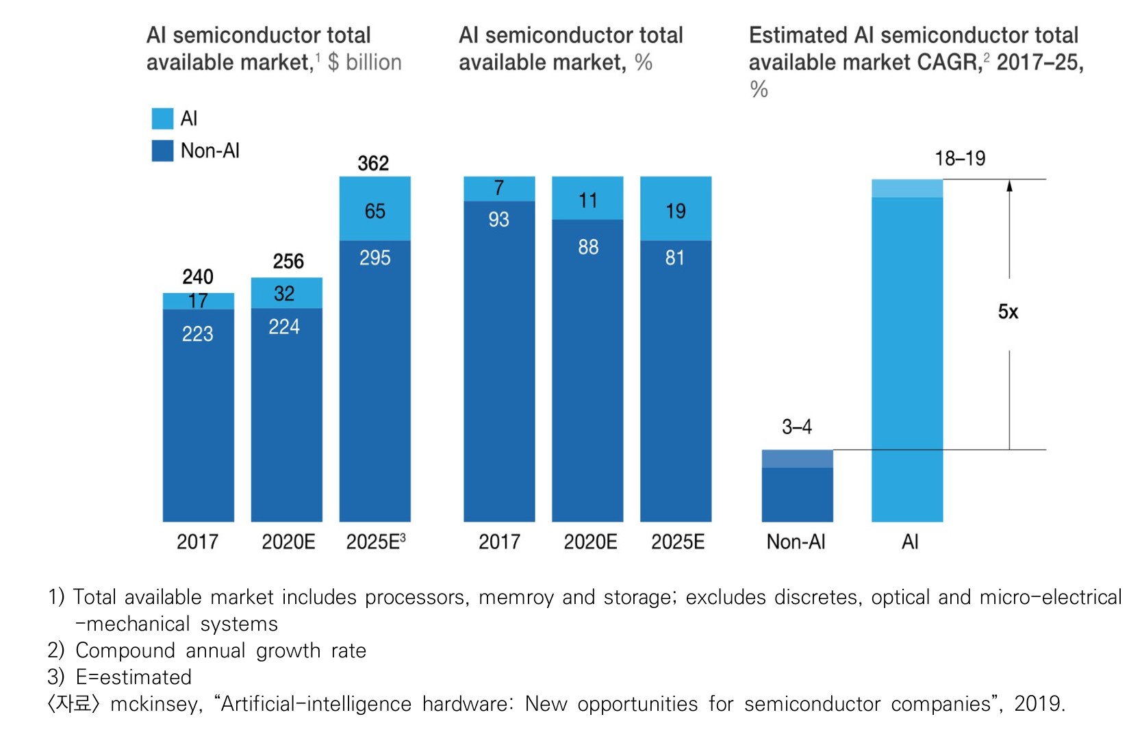 AI 관련 반도체는 향후 몇 년 동안 매년 약 18%의 성장률을 보일 것으로 예상되며, 이는 비 AI 애플리케이션에 사용되는 반도체의 성장률보다 5배 더 높은 수치입니다. 이러한 성장은 약 670억 달러의 매출로 이어질 것으로 전망되며, 데이터센터와 엣지 컴퓨팅 분야에서 큰 기회가 있을 것으로 예상됩니다.