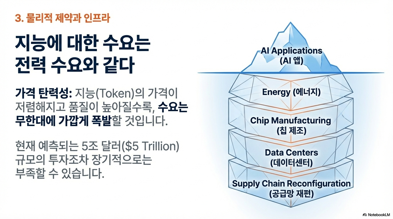 그는 AI 토큰에 대한 수요를 '전력 수요'에 비유하는 흥미로운 관점을 제시했습니다. 토큰에 대한 수요는 고정된 것이 아니라, **가격과 품질(지능 및 속도)**의 함수라는 것입니다. 모델이 더 똑똑해지고 토큰의 단가가 전력처럼 저렴해질수록 수요는 폭발적으로 증가할 것입니다. 결국 '가장 똑똑한 지능을 가장 저렴한 가격'에 공급하기 위한 인프라 전쟁이 AI 산업의 다음 전장이 될 것입니다.