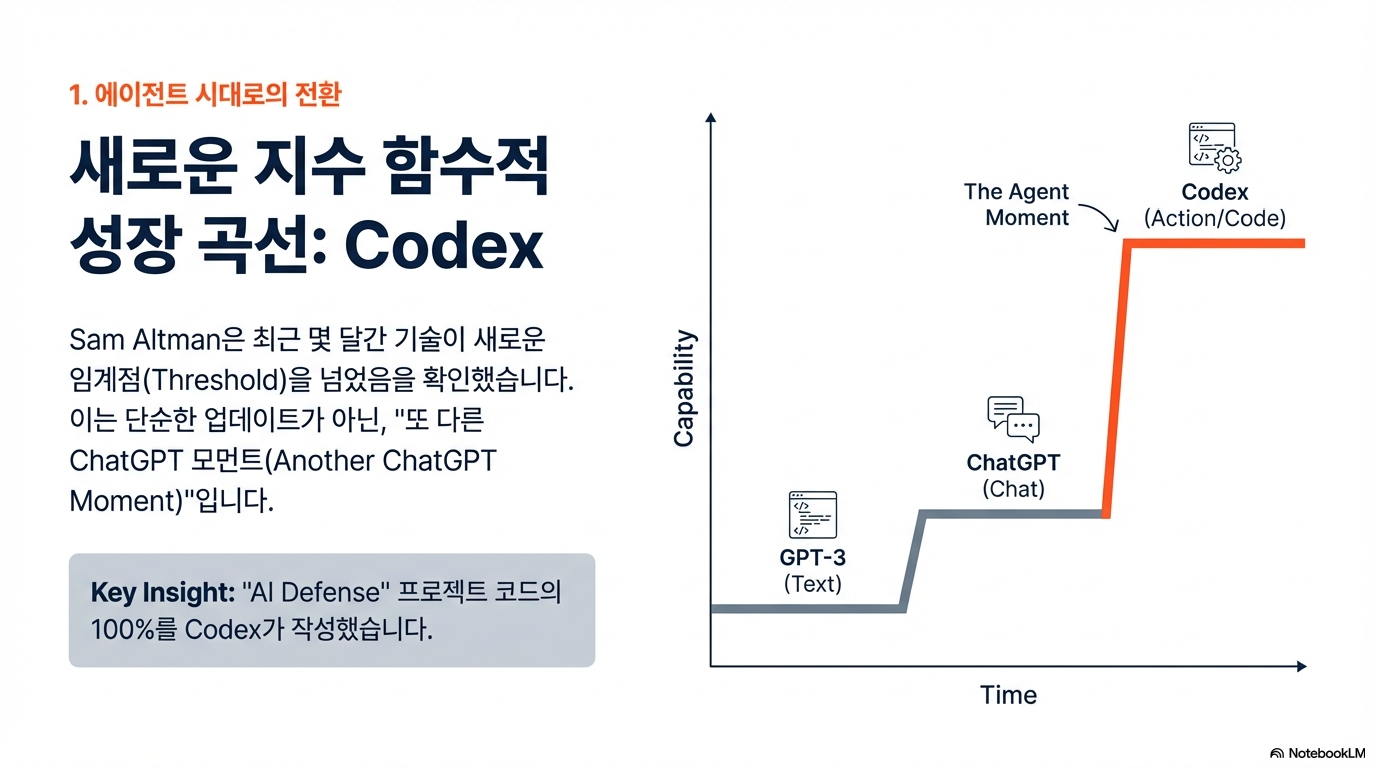 지식 노동의 미래는 우리가 예상했던 것보다 훨씬 가파른 지수적 곡선(Exponential Curve) 위에 있습니다. 샘 알트만은 최근 '코덱스(Codex)'의 비약적인 발전을 목격하며, 챗GPT가 처음 등장했을 때와 맞먹는, 혹은 그 이상의 강렬한 충격을 받았다고 밝혔습니다. 이는 단순한 기술적 업데이트를 넘어 기업과 개인이 AI를 사용하는 방식 자체가 근본적으로 재편될 것임을 알리는 명확한 신호입니다. 이제 AI는 보조 도구가 아니라, 지식 노동의 형식을 완전히 뒤바꿀 새로운 표준이 되고 있습니다.