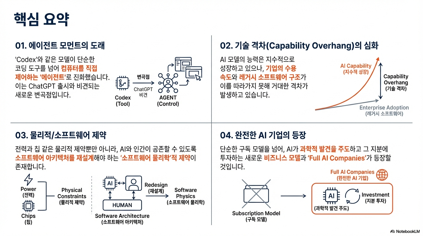 AI는 이미 과학적 발견을 돕고 복잡한 소프트웨어 전체를 작성할 수준에 도달했지만, 많은 기업은 여전히 기존의 보안 체계와 데이터 접근 권한 문제에 가로막혀 있습니다. 알트만은 이를 해결하기 위해 **'새로운 보안 및 데이터 접근 패러다임'**이 발명되어야 한다고 역설합니다. 이러한 기술적·조직적 장애물을 빠르게 제거하고 'AI 동료'를 조직 내로 흡수하는 속도가 향후 기업의 생존을 결정지을 것입니다.