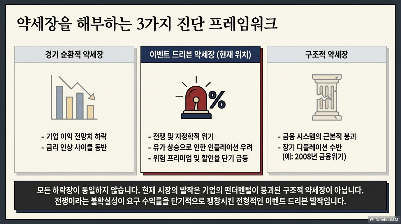 냉철한 분석가는 현재의 조정을 '붕괴'가 아닌 '성격의 변화'로 정의합니다. 약세장은 크게 경기 전망이 꺾이는 '경기 순환적', 돌발 악재로 심리가 무너지는 '이벤트 드리븐', 그리고 버블이 터지는 '구조적' 약세장으로 나뉩니다.