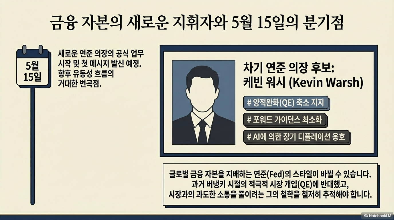향후 시장의 판도를 바꿀 결정적 변수는 연준(Fed)의 질적 변화입니다. 특히 시장은 5월 15일 전후를 기점으로 등장할 수 있는 '케빈 워시' 카드에 주목해야 합니다. 그는 과거 금융위기 직후 연준의 QE(양적 완화) 정책에 반대하며 사표를 던졌던 원칙론자입니다.