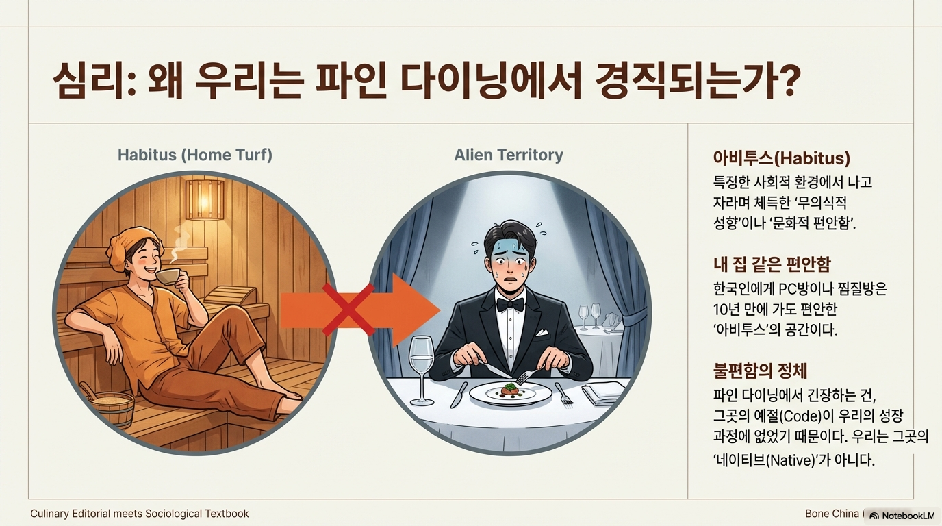 많은 사람들이 파인 다이닝 레스토랑에서 느끼는 불편함과 경직됨은 사회학자 피에르 부르디외가 말한 **'아비튀스(Habitus)'**의 개념으로 설명할 수 있다. 이는 개인이 특정 사회 환경 속에서 성장하며 자연스럽게 체화한 문화적 취향과 행동 양식을 의미한다. 그 공간과 문화가 어린 시절부터 체화된 자신의 것이 아니기 때문에 느끼는 현상인 것이다. 최고급 레스토랑에서 포크와 나이프 사용법 하나에 긴장하는 것은 당연한 일이다.