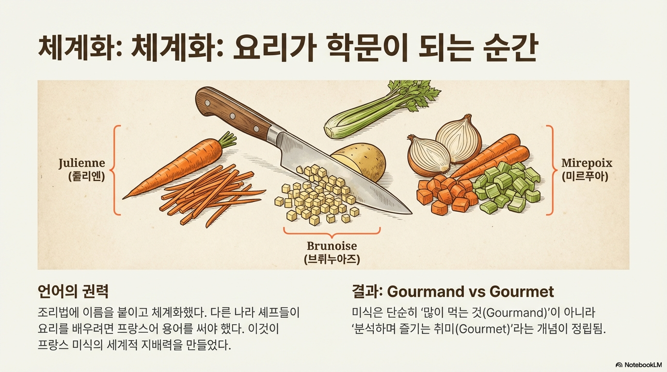 그러나 프랑스에서 요리는 점차 생존을 위한 행위를 넘어 '지적으로 분석하고 예술로 즐기는' 대상으로 분화되기 시작했다. 프랑스의 진정한 혁신은 뛰어난 요리를 만든 것에 그치지 않고, 요리에 대해 논하고 평가하는 **'언어와 담론의 체계'**를 창조한 데 있다. 브리아사바랑과 같은 전문 평론가를 배출하고, '줄리앙(julienne)'이나 '포와레(poêlé)' 같은 조리법 용어를 체계화함으로써, 프랑스는 전 세계 요리의 언어를 장악했다. 다른 나라의 셰프들조차 자신의 요리 기술을 설명하기 위해 프랑스어를 빌려 써야만 했다.