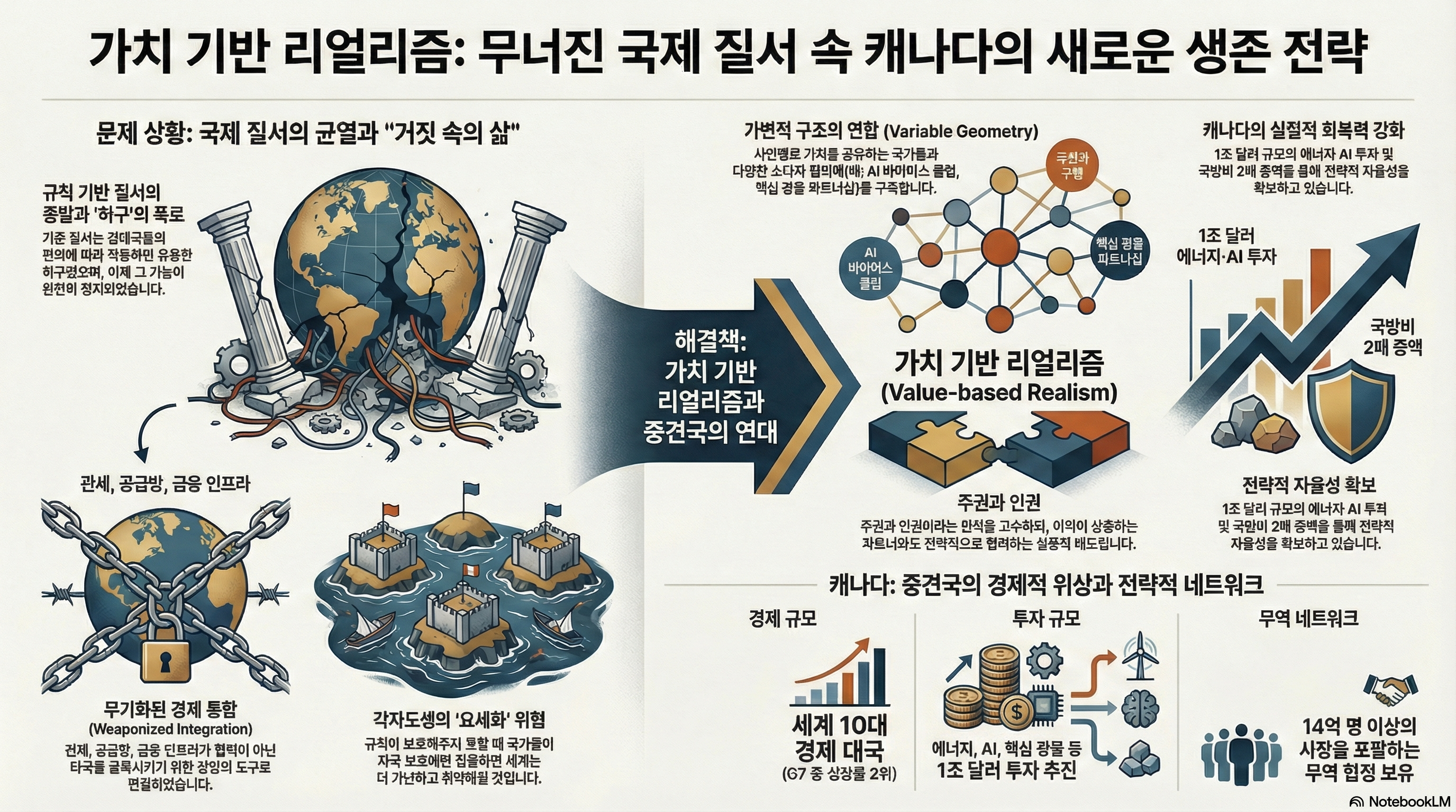 마크 카니 총리의 연설은 명확한 전략적 청사진을 제시합니다. 유쾌한 허구였던 옛 질서의 종언을 직시하고(1), 압력에 저항할 수 있는 내실을 다져 진정한 주권을 확보한 뒤(2), 다른 중견국들과 힘을 합쳐(3) '가변 기하학'이라는 유연한 방식으로 공동의 이익을 추구해야 한다(4)는 것입니다.