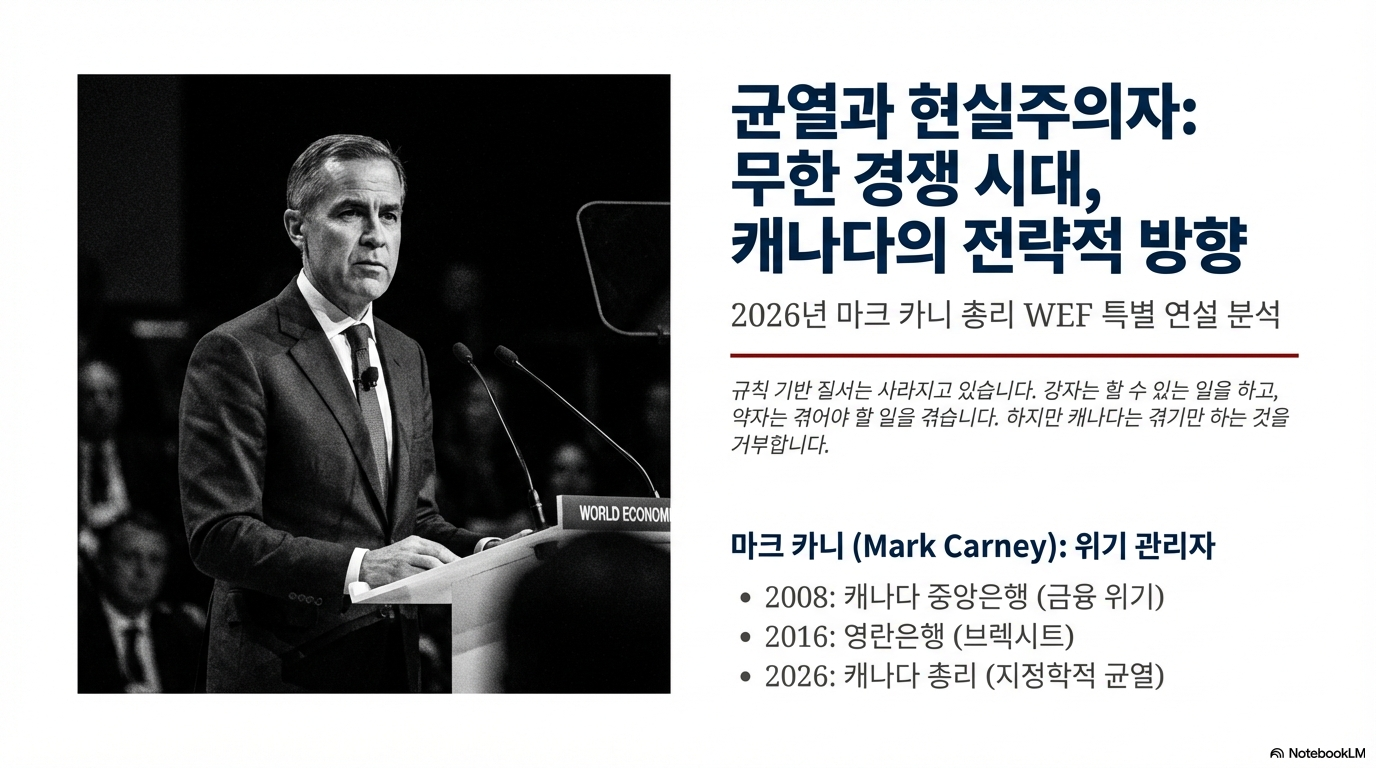 최근 마크 카니 캐나다 총리가 전한 연설은 단순한 경고가 아니었습니다. 그는 우리가 겪고 있는 변화가 완만한 '전환(transition)'이 아닌 갑작스러운 '파열(rupture)'이라고 선언하며, 지정학의 냉혹한 현실을 직시할 것을 촉구했습니다. 그의 분석은 단순한 진단을 넘어, 강대국들 사이에 낀 중견국들을 위한 새로운 외교 정책의 실질적인 청사진을 제시합니다.