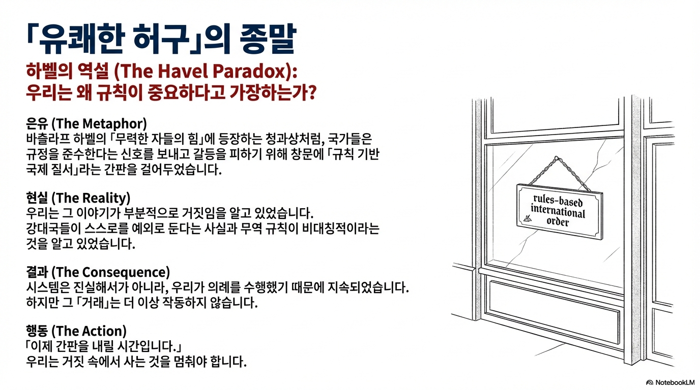 카니 총리는 이 상황을 바츨라프 하벨의 에세이 '힘없는 자들의 힘'에 나오는 '청과물상' 비유로 꿰뚫습니다. 공산주의 체제 하의 청과물상은 신념 때문이 아니라 문제를 피하고 순응을 표하기 위해 매일 아침 창문에 '만국의 노동자여, 단결하라!'는 팻말을 내겁니다. 모든 상점 주인이 똑같이 행동했기에, 그 거짓된 구호가 마치 진실인 것처럼 시스템이 유지되었습니다. 중견국들 역시 이와 비슷하게 '규칙 기반 질서'라는 팻말을 창문에 내걸고 그 허구에 참여해 왔다는 것입니다.