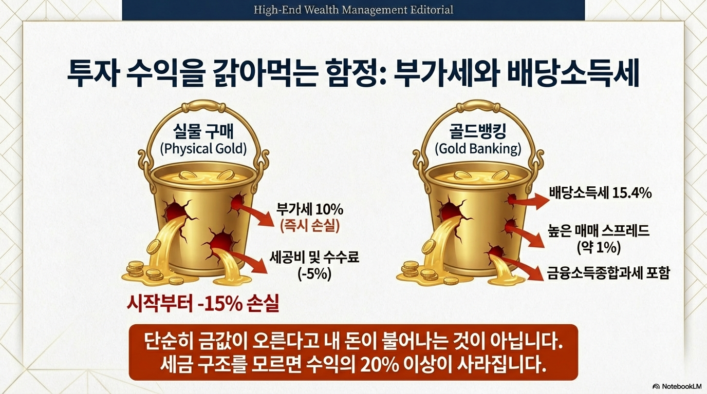 먼저, 금은방에서 현물(골드바 등)을 구매할 경우 **부가가치세 10%**와 세공비 등 추가 비용이 붙습니다. 이는 구매하는 순간부터 약 -15%의 손실을 안고 시작하는 것과 같습니다. 100만 원어치 금을 사려면 115만 원을 내야 하는 셈입니다.