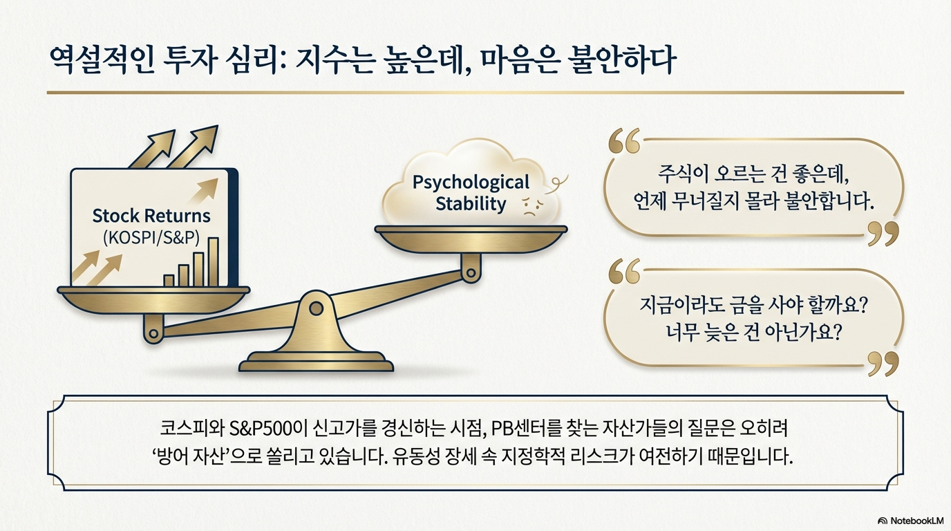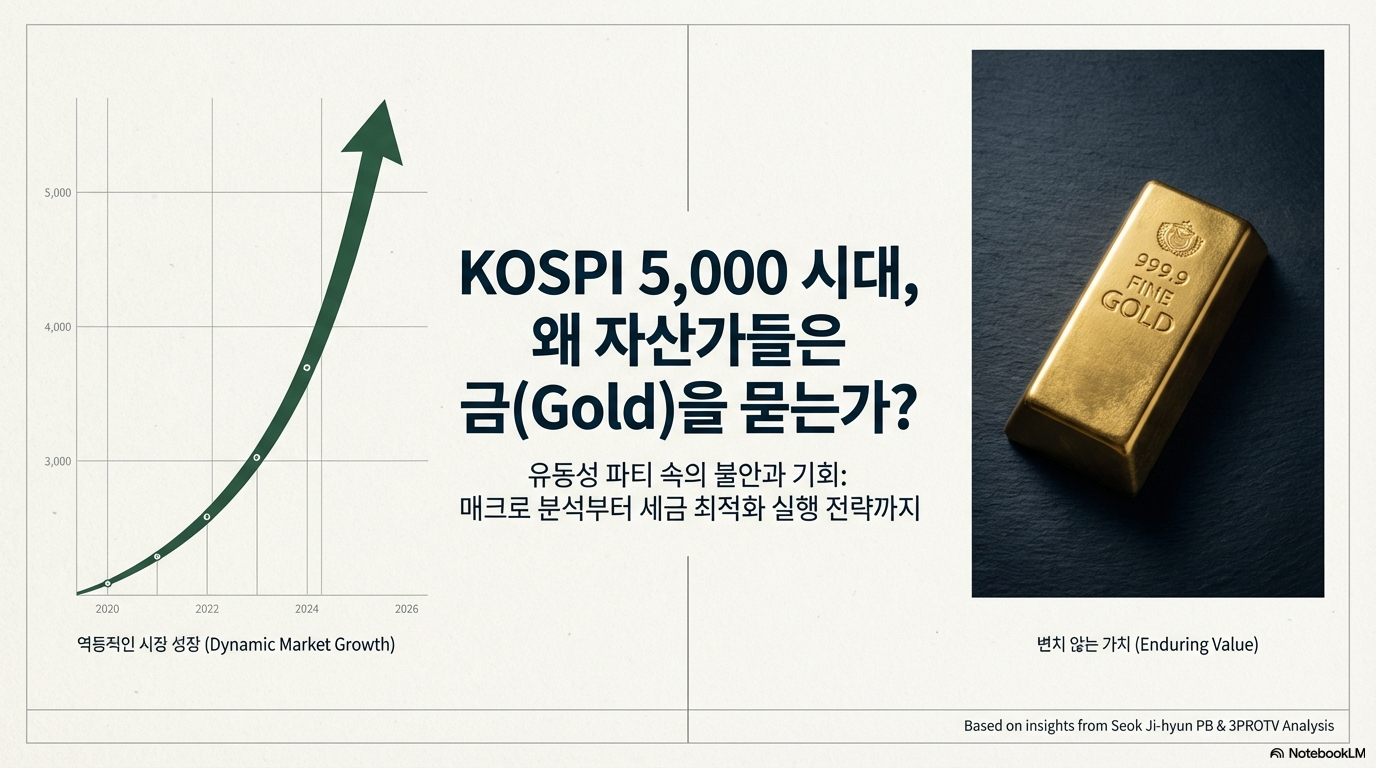 코스피 지수가 5000 고지를 넘나들며 주식 시장은 그 어느 때보다 뜨겁습니다. 모두가 환호하며 주식을 이야기할 때, 오히려 금과 같은 안전자산에 대한 문의가 늘어나는 역설적인 상황이 벌어지고 있습니다. "지금이라도 금을 사도 될까요?", "코스피가 이렇게 좋은데 굳이 금에 투자해야 하나요?"라는 질문이 쏟아집니다.