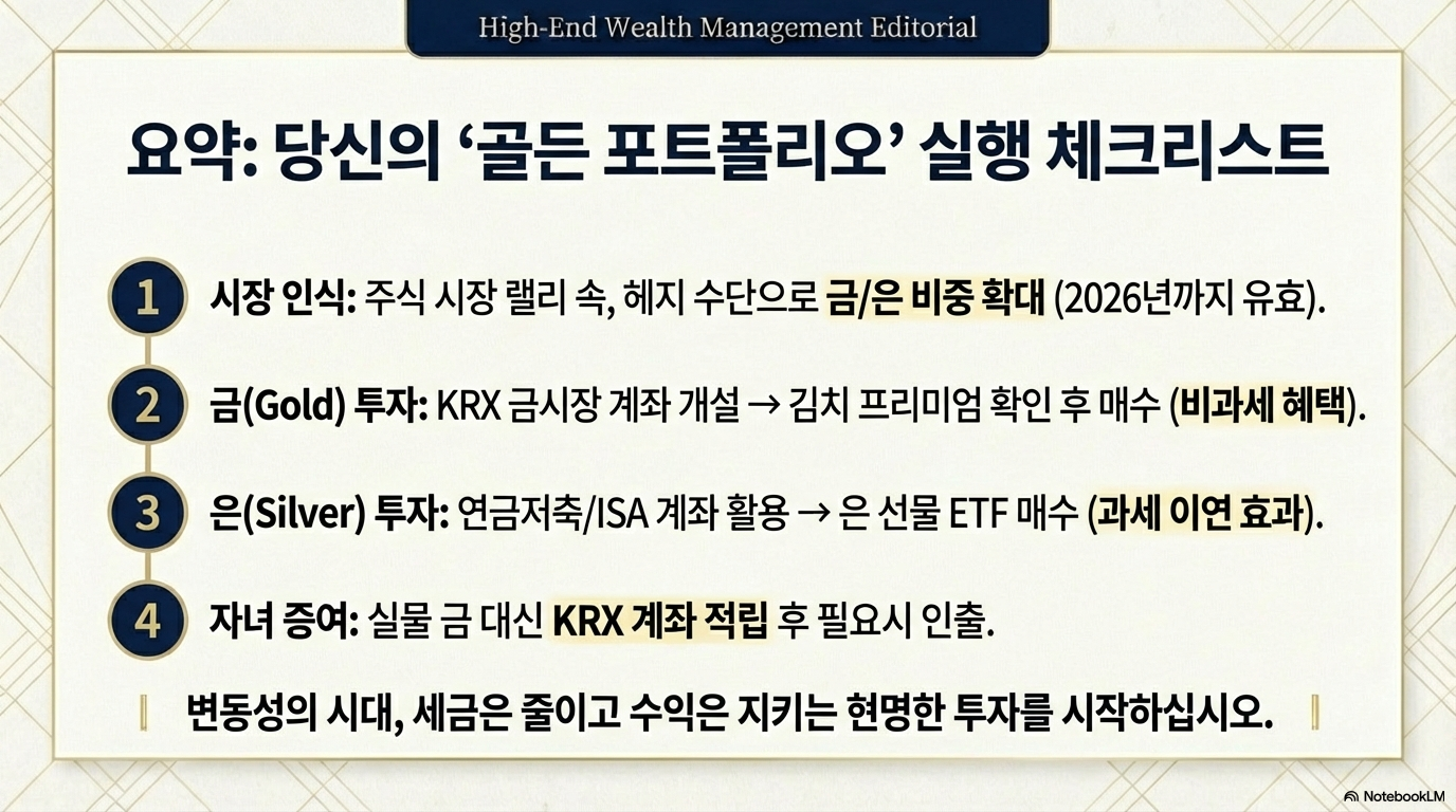 지금까지 우리는 금과 은 투자를 둘러싼 5가지 핵심 포인트를 살펴보았습니다. 주식과 금의 관계, 은의 산업적 가치, 역사적 랠리 주기, 잘못된 투자 방법, 그리고 가장 효율적인 절세 투자법까지. 이는 금과 은 투자가 단순히 가격의 오르내림을 쫓는 행위를 넘어, 세금과 거래 방식, 거시 경제에 대한 깊은 이해가 필요한 전문적인 영역임을 보여줍니다.