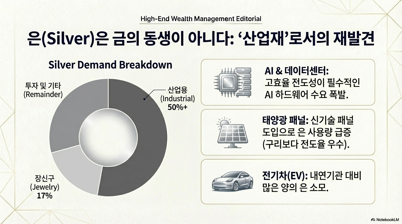 은의 폭발적인 성장은 산업 수요에 기반합니다. 은 수요의 50% 이상이 태양광, 전기차, AI 데이터센터 등 첨단 산업에서 발생합니다. 특히 기존 기술보다 더 많은 양의 은을 필요로 하는 새로운 태양광 패널 기술이 도입되고, AI 데이터센터에서는 ‘은이 아니면 안 될 정도의’ 높은 전도율을 요구하면서 수요가 폭발하고 있습니다.