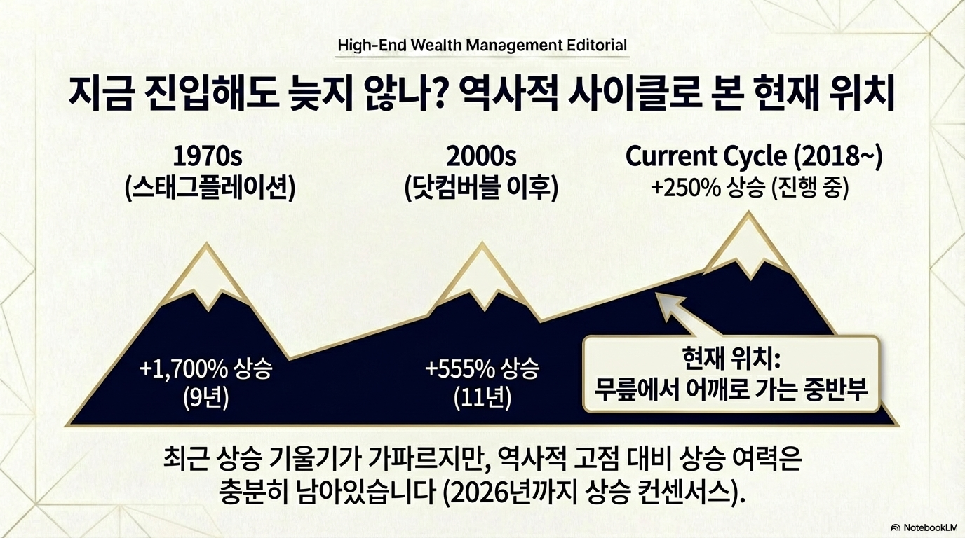 현재의 랠리는 2018년부터 시작해 약 250% 상승한 상태입니다. 물론 과거가 미래를 보장하진 않지만, 역사적 관점에서 본다면 아직 상승 여력이 남아있을 가능성을 시사합니다. 전문가들이 현재를 '랠리의 끝'이 아닌 '중반부'로 보는 이유입니다.