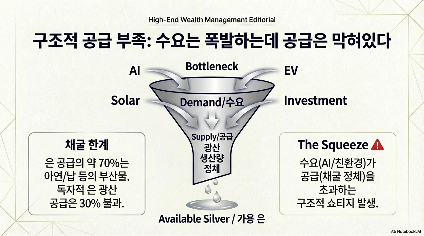 반면 공급은 수요를 전혀 따라가지 못하는 구조적 문제를 안고 있습니다. 은 공급은 지난 5년간 거의 늘지 않았으며, 대부분이 아연과 같은 다른 광물을 채굴할 때 나오는 '부산물' 형태입니다. 즉, 은 가격이 오른다고 해서 생산량을 마음대로 늘릴 수 없는 것입니다. 폭발하는 수요와 경직된 공급. 이것이 바로 우리가 배우던 '수요 공급 법칙'이 은 시장에서만큼은 다르게 작동하는 이유입니다.