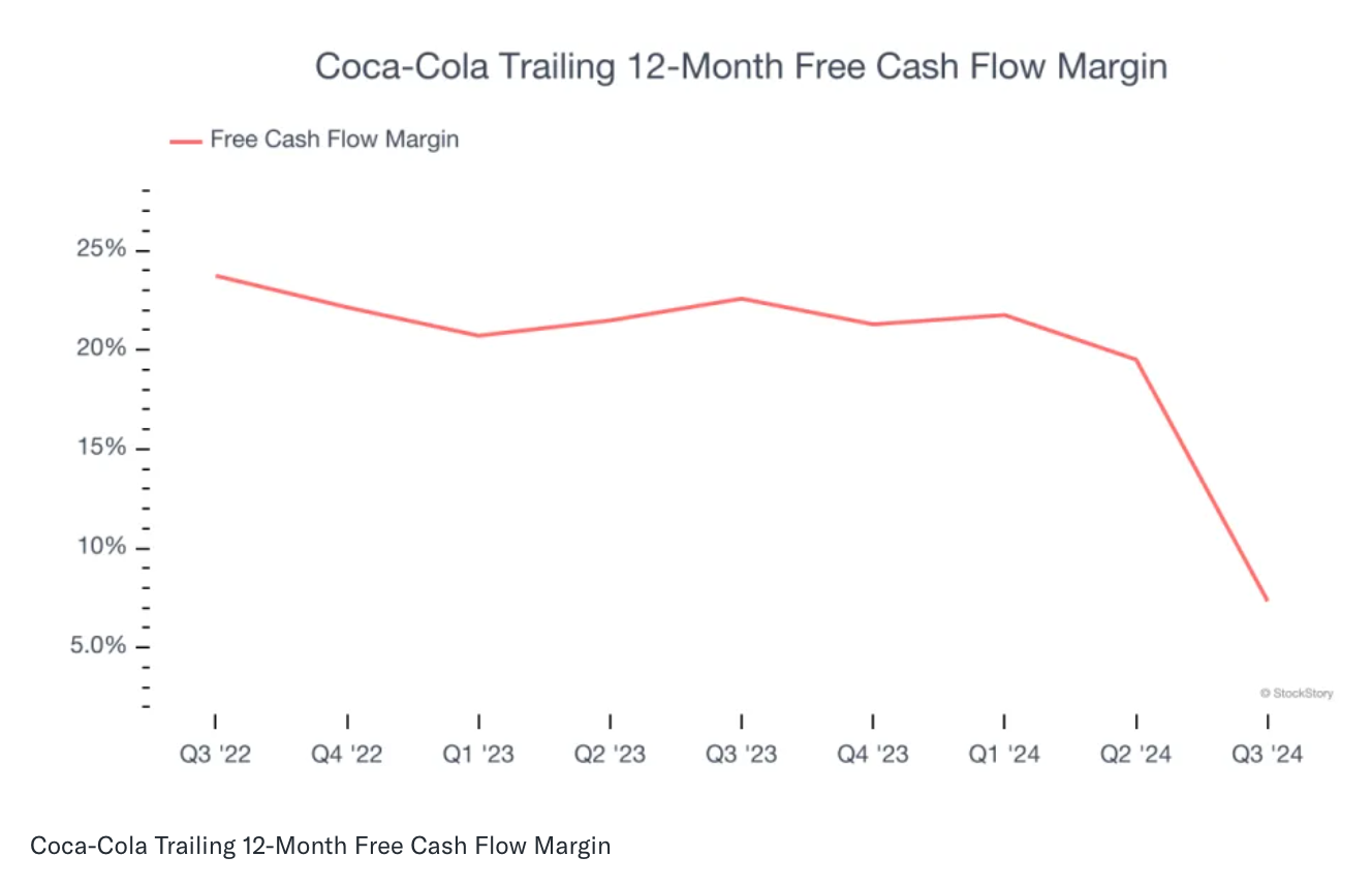코카콜라의 운영 마진은 지난 12개월 동안 20.6%를 기록하며 4.1%포인트 감소했습니다. 높은 수준의 마진을 유지하고 있지만, 지속적인 하락세는 투자자들의 우려를 키우고 있습니다. - 자유 현금 흐름(Free Cash Flow) 감소