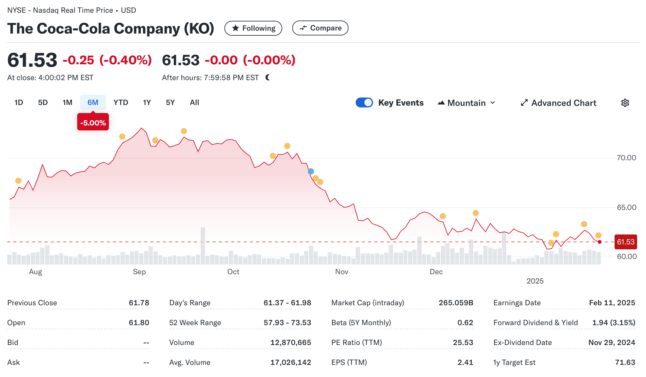 지난 장 마감에서 코카콜라(NYSE: KO)의 주가는 $61.53로 전일 대비 0.4% 하락했습니다. 이는 S&P 500의 일일 상승률 0.53%를 밑돌았으며, 다우지수는 0.93% 상승, 기술주 중심의 나스닥은 0.22% 상승한 것과 대조적입니다.