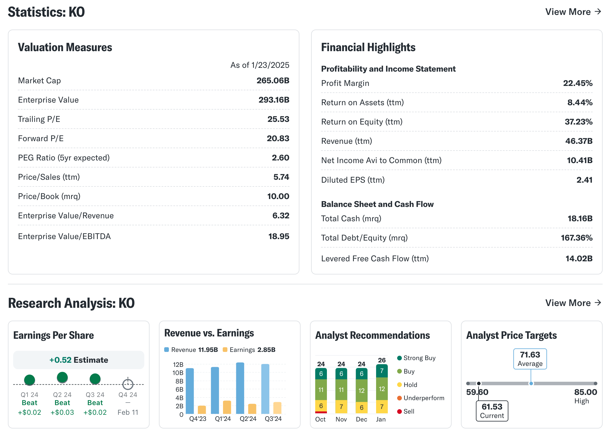 투자자들이 기업의 주가 움직임을 예측할 때, 애널리스트들의 전망 변화는 중요한 참고자료가 됩니다. 코카콜라에 대한 최근 애널리스트들의 EPS(주당순이익) 컨센서스는 0.28% 상향 조정되었으며, 이는 투자자들에게 긍정적인 신호로 해석될 수 있습니다. 이러한 전망 변경은 주로 단기적인 사업 동향이나 외부 환경 변화에 따라 조정되며, 기업의 수익성 및 성장 가능성에 대한 시장의 신뢰를 반영합니다. 애널리스트의 긍정적인 전망 변화는 일반적으로 주가 상승 압력을 유발할 가능성이 높으므로, 이러한 변화에 주목해야 합니다. - 밸류에이션 지표: 프리미엄 거래 상태