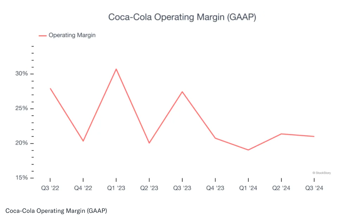 월가 애널리스트들의 예측에 따르면, 코카콜라의 향후 12개월 매출 성장률은 2.1%로 전망됩니다. 이는 과거 3년 동안 연평균 성장률 7.1%에 비해 상당히 낮은 수치로, 수요 둔화 가능성을 시사합니다. - 운영 마진 하락