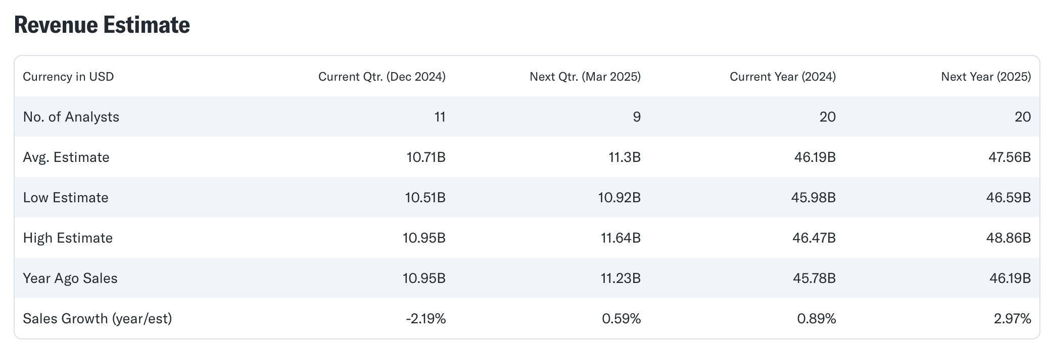 월가 애널리스트들의 전망에 따르면, 코카콜라의 향후 12개월 매출 성장률은 2.1%로 예상됩니다. 이는 과거 3년 동안 기록했던 연평균 성장률 7.1%에 비해 현저히 낮은 수치입니다. 이와 같은 성장 둔화는 두 가지 요인에서 기인할 수 있습니다:- 전 세계적으로 탄산음료에 대한 수요 감소 및 소비자들의 건강에 대한 관심 증가.