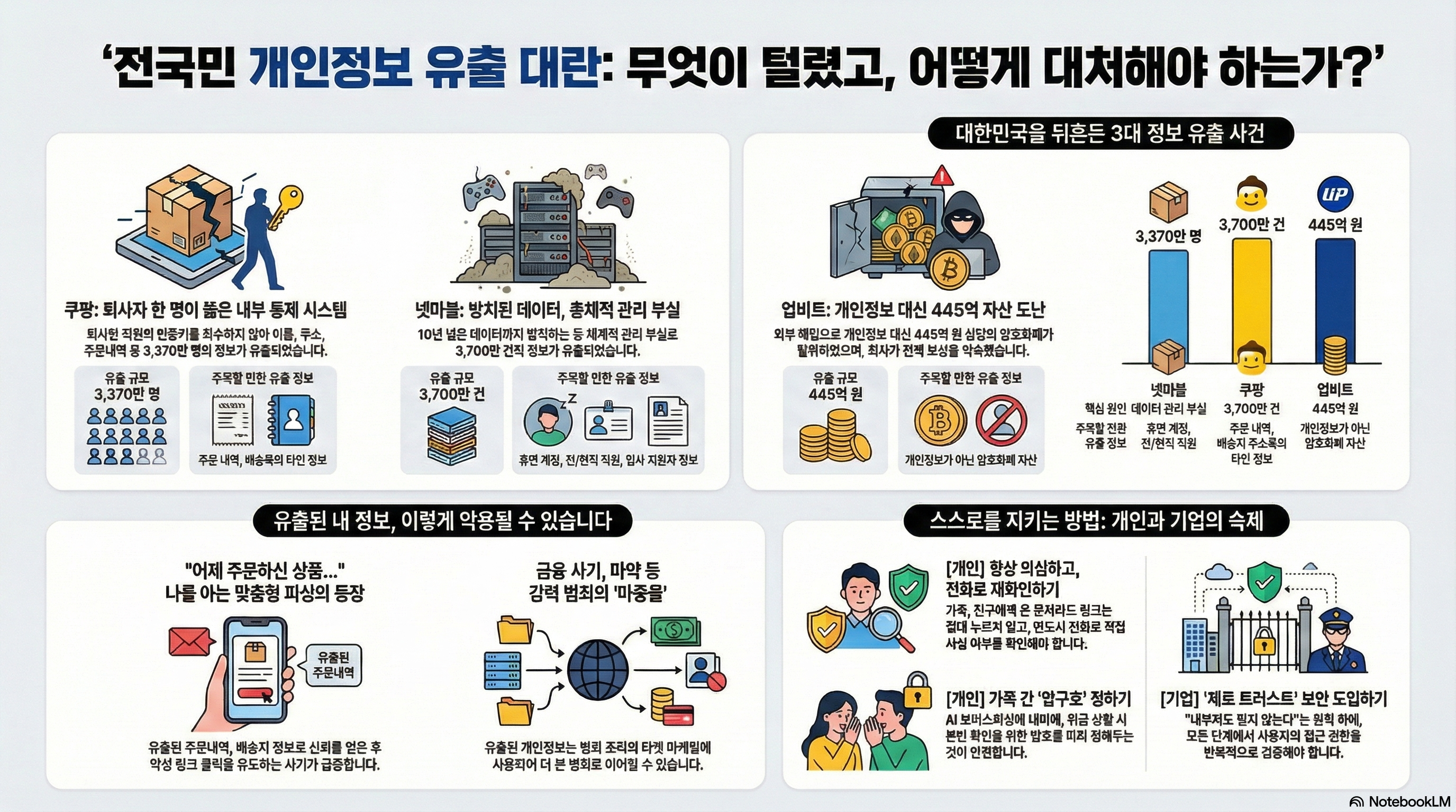 최근 쿠팡에서 3,370만 건, 넷마블에서 3,700만 건이라는 천문학적인 규모의 개인정보 유출 사건이 터졌습니다. 연초 통신 3사부터 롯데카드, S24까지, 이제 개인정보 유출은 남의 이야기가 아닙니다. 여기서 주목해야 할 점은 쿠팡의 유출 규모가 '3,370만 명'이 아닌 '3,370만 건'이라는 사실입니다.