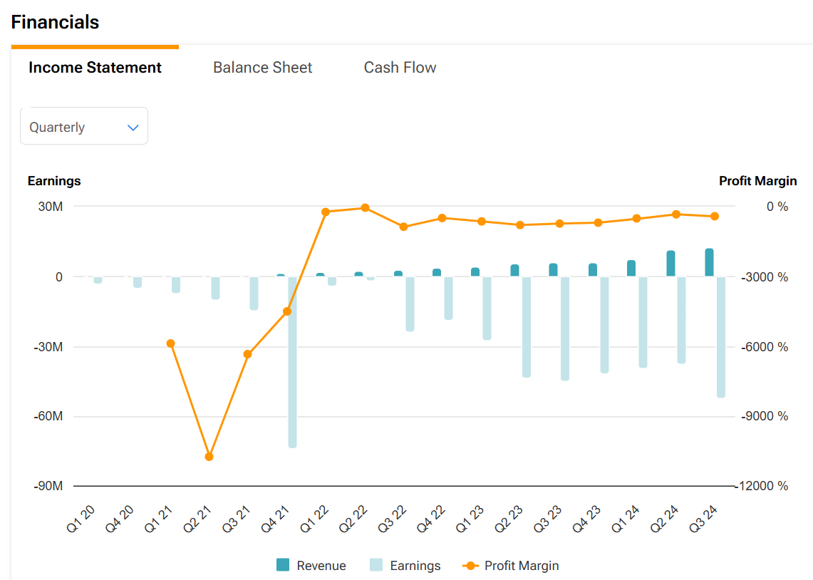 IonQ는 현재 약 84억 달러의 시가총액을 기록하며 퀀텀 컴퓨팅 기업 중 상대적으로 높은 가치를 인정받고 있다. 하지만 재무제표를 살펴보면, 아직 흑자 전환이 요원한 상태다.
