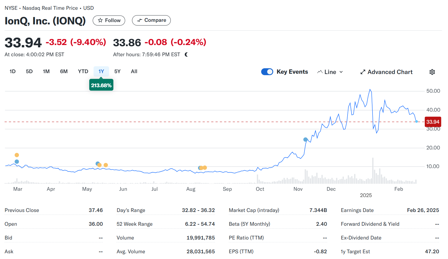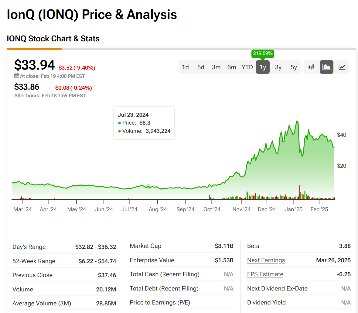IonQ는 퀀텀 컴퓨팅 기업 중에서도 트랩드 아이온(Trapped-Ion) 기술을 기반으로 한 독창적인 접근 방식을 가진 기업으로 평가받으며, 지난 1년 동안 주가가 무려 285% 상승하는 기염을 토했다. 하지만 이렇게 급격한 상승이 기술적 발전과 실적 개선에 의한 것인지, 아니면 단순한 시장의 기대감과 투기적 움직임 때문인지에 대한 의문이 제기되고 있다.