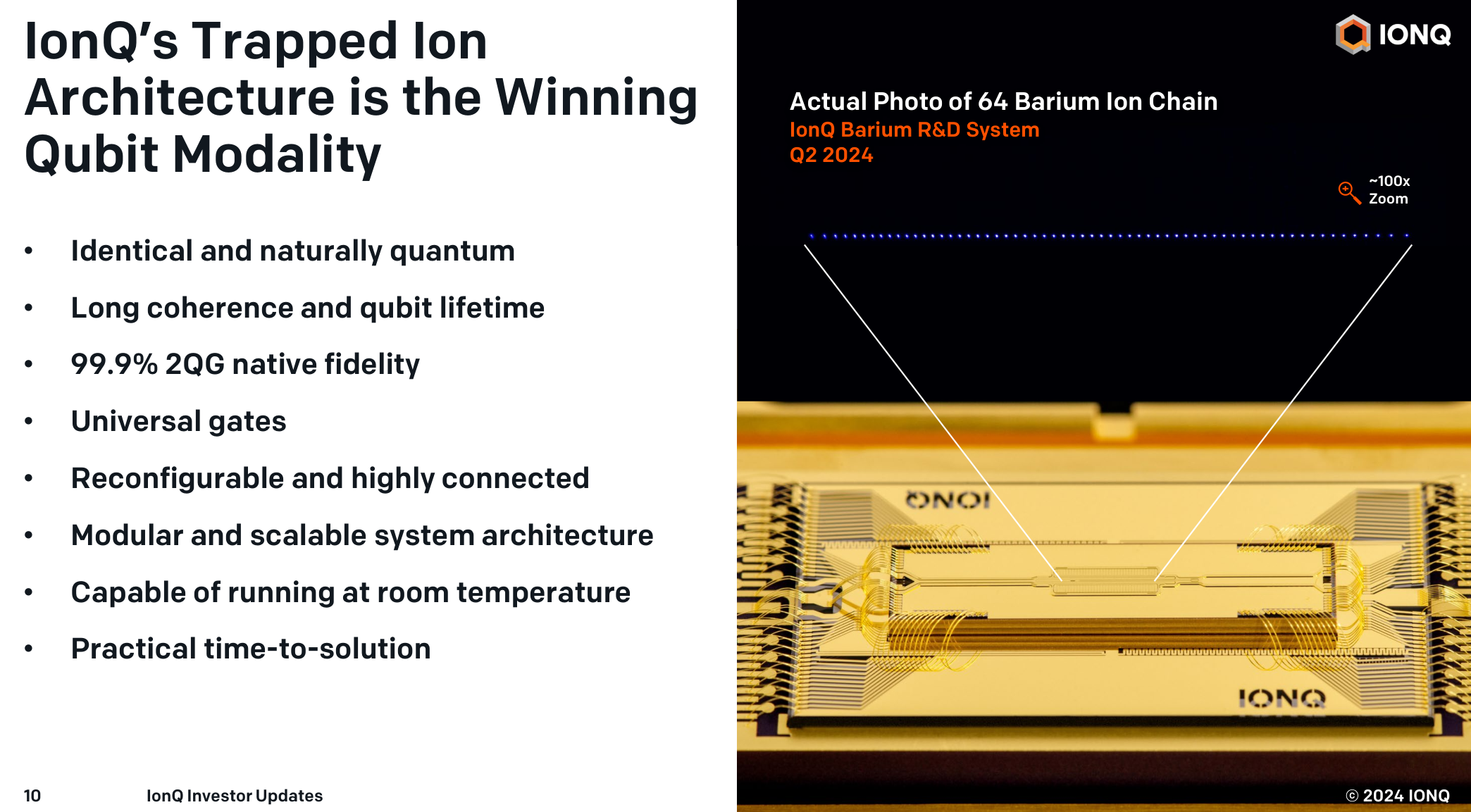 IonQ는 이러한 퀀텀 컴퓨팅 시장에서 트랩드 아이온(Trapped-Ion) 기술을 기반으로 경쟁력을 확보하려 한다. 이 기술은 다른 주요 방식인 초전도체(Superconducting Qubit) 기반 퀀텀 컴퓨터와 비교해 여러 장점이 있다.