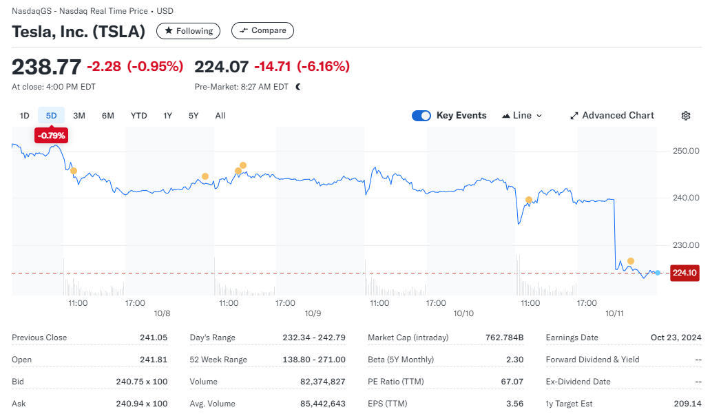2024년 4월부터 로보택시에 대한 기대감으로 테슬라 주가는 약 50% 상승했으나, 이번 발표가 기대에 미치지 못하면서 주가는 다시 하락했습니다. 발표 후 주가는 5.5% 하락하며 그간의 상승분 일부를 상쇄했습니다.