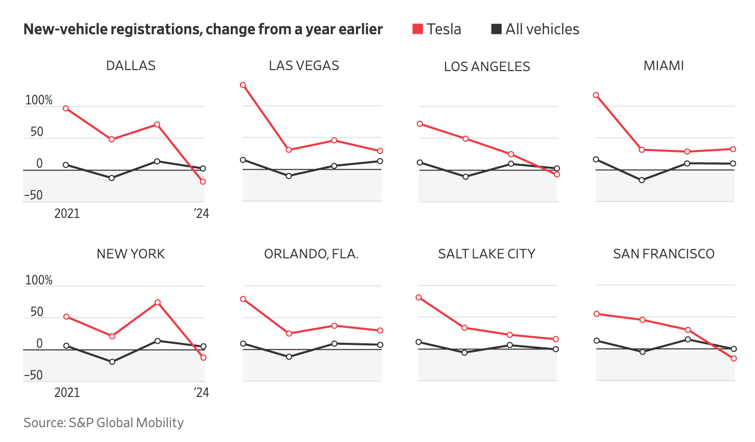 - 자동차 컨설팅 업체 Strategic Vision의 조사에 따르면, 2022년까지 자동차 구매 희망자 중 22%가 테슬라를 "강력히 고려할 것"이라고 답했지만, 2023년 여름에는 7%로 급감했다.