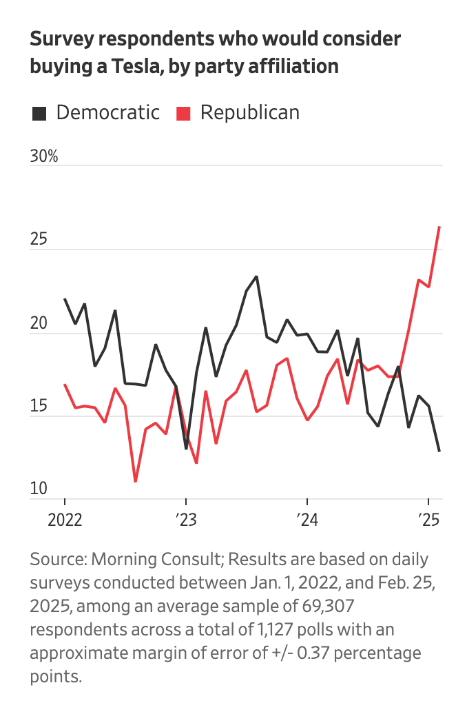 특히 민주당 성향의 진보적인 소비자들 사이에서 테슬라에 대한 관심이 급격히 줄어들었다.