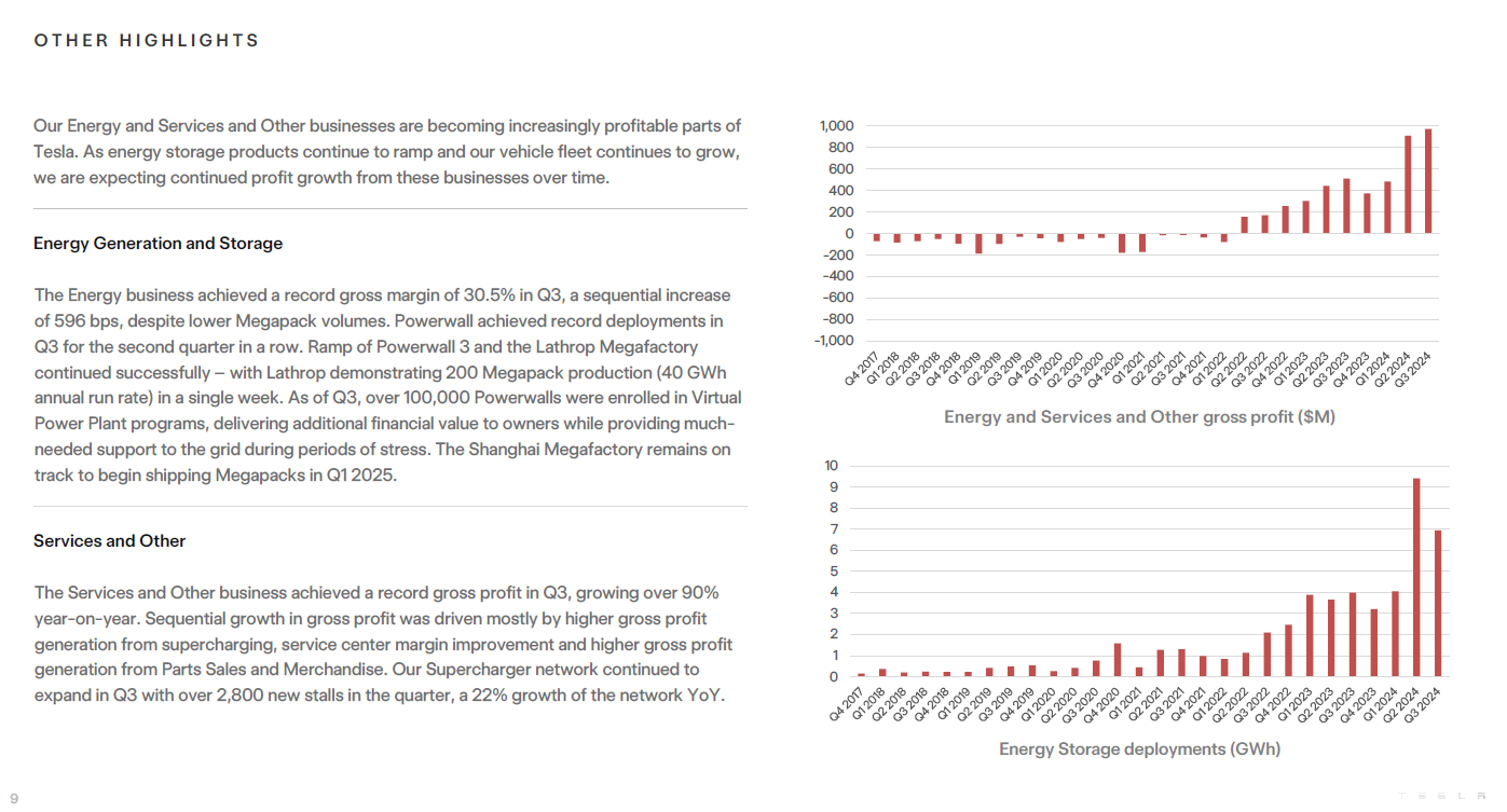 테슬라는 3분기 동안 서비스 및 기타 부문에서 기록적인 성과를 달성했습니다. 서비스 부문은 슈퍼차저(Supercharger) 네트워크 확장, 서비스 센터 이익 개선, 부품 판매 증가 등으로 인해 영업 이익이 90% 이상 증가했습니다​. 테슬라의 슈퍼차저 네트워크는 이번 분기에 22% 확장되어, 글로벌 인프라 확장이 지속되고 있습니다​.
