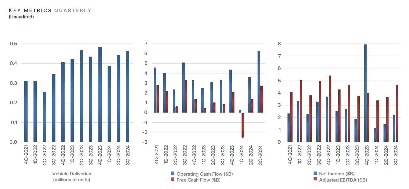 • 슈퍼차저 네트워크 확장: 테슬라는 3분기 동안 슈퍼차저 네트워크를 22% 확장하며 전 세계적으로 6,706개의 슈퍼차저 스테이션을 운영하고 있습니다. 이는 충전 인프라가 전기차 보급에 중요한 역할을 한다는 점을 고려할 때, 테슬라의 경쟁 우위를 더욱 공고히 하는 요소로 작용하고 있습니다. 슈퍼차저 네트워크의 확장은 테슬라 차량 소유자에게 빠르고 효율적인 충전 경험을 제공하며, 충전 수익의 증가에도 기여하고 있습니다​.