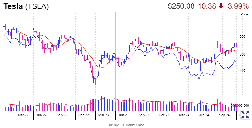 그러나 8월 이후 테슬라 주가는 반등하기 시작해 새로운 기반을 다지고 있습니다. 특히 10월 10일에 예정된 로보택시 이벤트와 3분기 실적 발표가 주가에 중요한 전환점이 될 것으로 기대됩니다. 현재 테슬라는 264.86달러의 컵-위드-핸들(cup-with-handle) 매수 포인트를 형성하고 있으며, 이 이벤트들이 주가에 큰 영향을 미칠 수 있습니다.