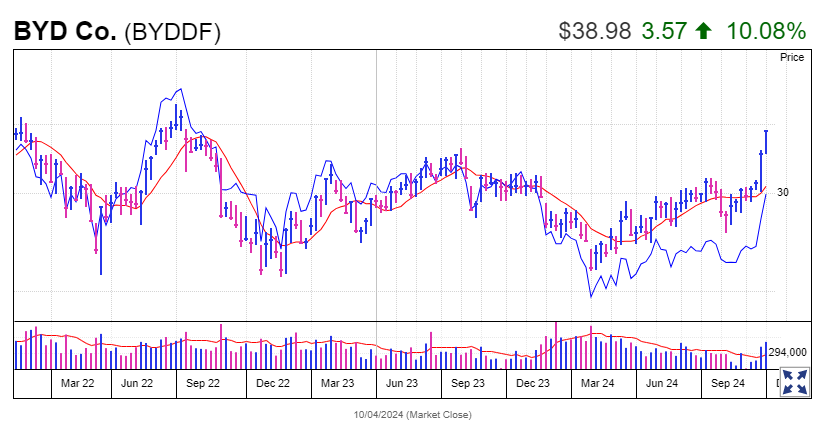 9월 중국 정부의 경기 부양책 발표 이후, 비야디는 다른 중국 주식들과 함께 급등했으며, 36.27달러의 공식 매수 포인트를 넘어섰습니다. 또한 10월 초 비야디는 2년 만에 최고점을 기록하며 상승세를 지속했습니다. 비야디의 홍콩 및 선전 증시에 상장된 주식은 미국에서 장외 거래로 매매되며, 거래 초반에는 미니 스파이크나 급등락이 발생하는 경향이 있습니다.
