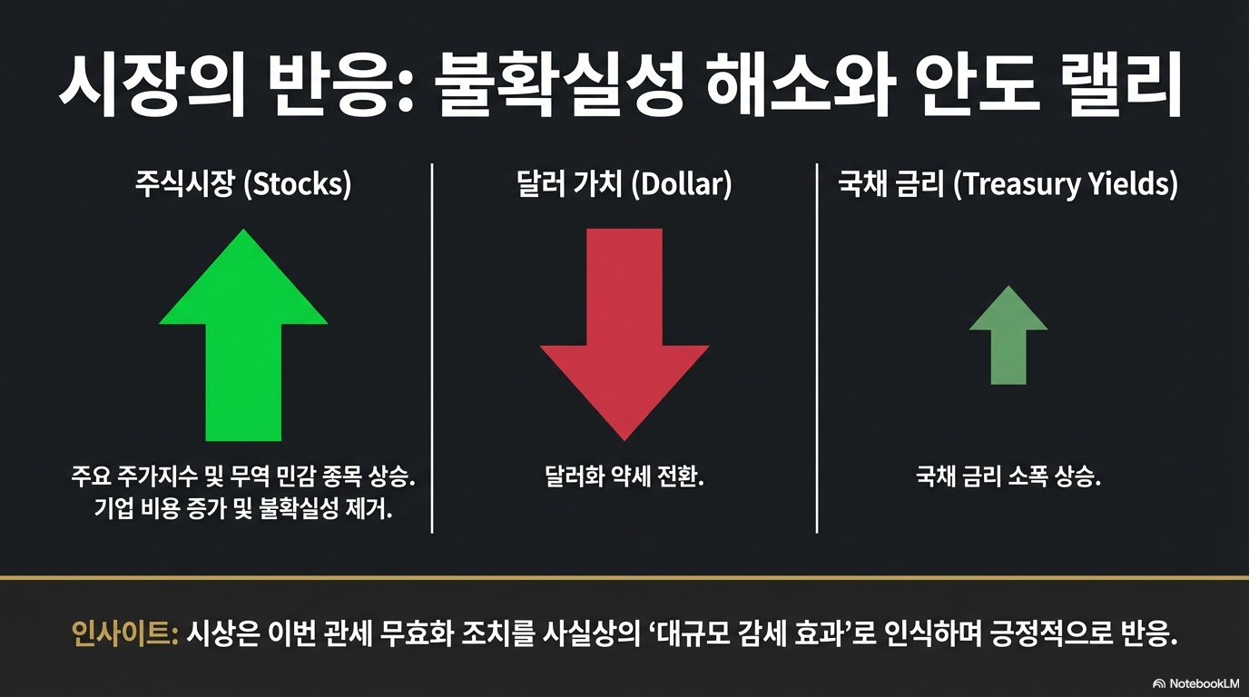 시장은 즉각 반응했습니다. 관세가 초래한 불확실성이 일부 해소되자 주요 주가지수는 반등했고, 관세 노출도가 높은 기업들의 주가가 강세를 보인 반면 달러 가치는 하락하며 경제적 안도감을 반영했습니다.