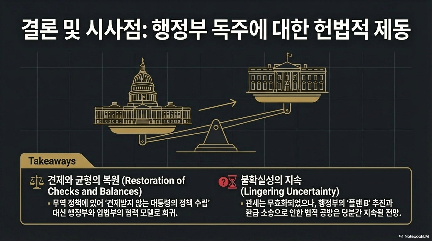 대법원은 관세 부과와 같은 중차대한 결정이 의회의 명시적 승인 없이 행정부의 자의적 해석만으로 이루어질 수 없다고 못 박았습니다. 이는 향후 트럼프 행정부가 의회를 우회하여 행정명령만으로 국가 시스템을 개조하려는 시도에 강력한 법적 족쇄가 될 것임을 의미합니다. 이번 판결로 인해 대통령이 누려온 '신속하고 유연한' 비상 권한의 범위는 대폭 축소되었습니다.