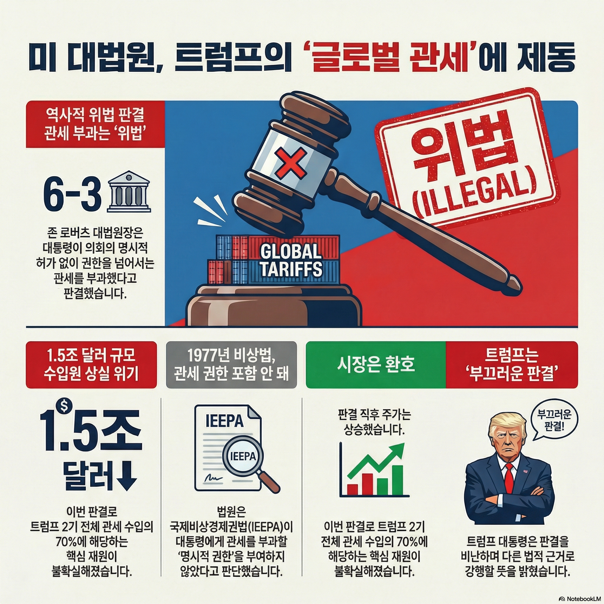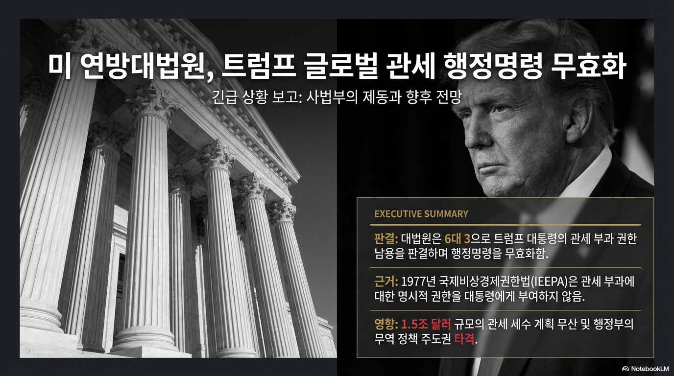 미 행정부의 가장 강력한 경제적 무기였던 '글로벌 관세'가 사법부의 거대한 벽에 부딪혔습니다. 연방 대법원이 도널드 트럼프 대통령의 핵심 정책을 '위법'으로 규정하며 제동을 건 이번 판결은 대통령의 행정권과 의회의 입법 고유권이 정면 충돌한 역사적 사건입니다.
