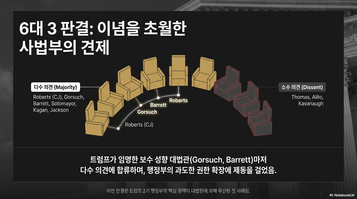 이번 6대 3 판결은 단순한 이념적 대립을 넘어선 '초이데올로기적 연대'의 결과라는 점에서 상징성이 큽니다. 보수 성향의 로버츠, 고서치, 배럿 대법관이 진보 성향 대법관들과 손을 잡았기 때문입니다. 특히 고서치와 배럿은 트럼프 대통령이 임명한 인물임에도 불구하고, 대통령의 권력 행사보다 헌법적 절차와 견제와 균형이라는 원칙을 우선시했습니다.