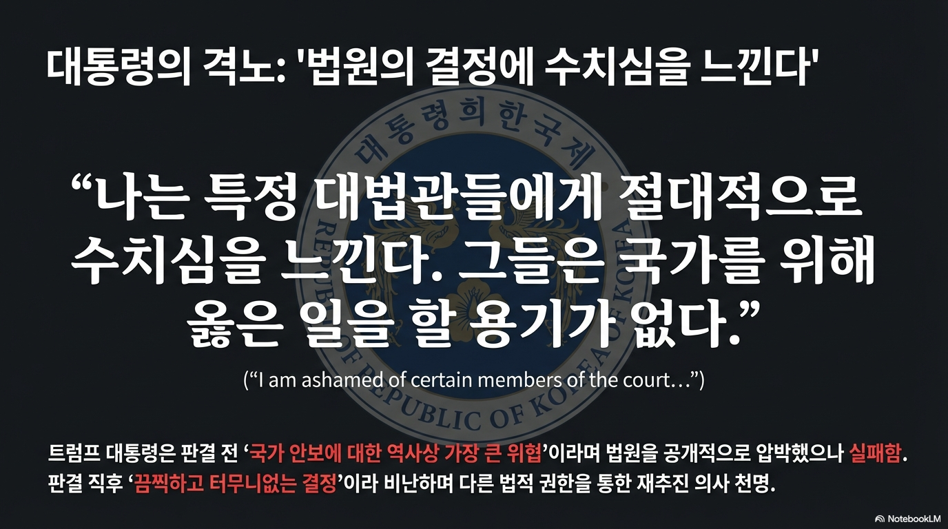 이러한 사법부의 기류는 하급심에서도 이미 감지되었습니다. 이번 사건과 관련된 하급심 판결들에 참여한 15명의 판사 중 11명이 트럼프의 관세 조치를 위법으로 판단했을 만큼 사법부 내의 공감대는 두터웠습니다. 이에 트럼프 대통령은 즉각적인 분노를 표출하며 사법부와의 전면전을 예고했습니다.