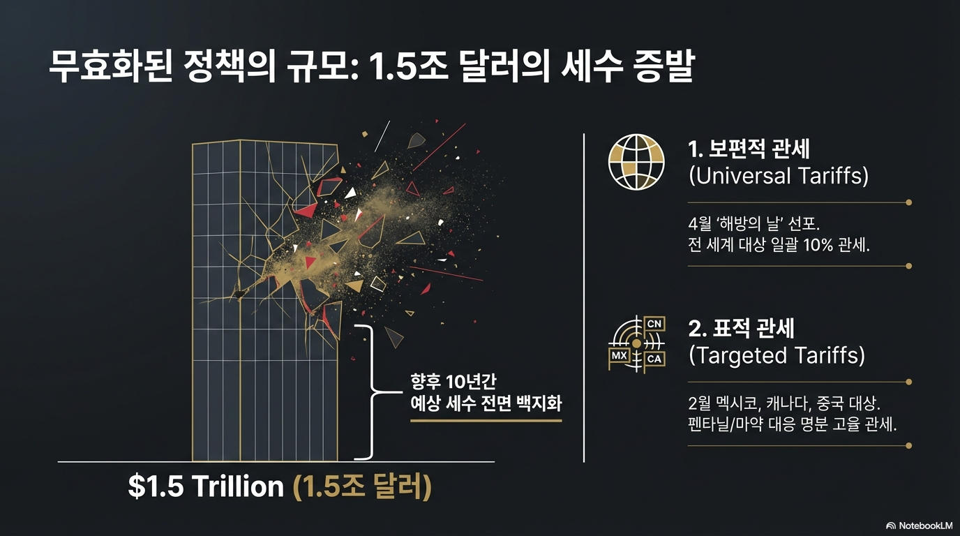 경제적 측면에서 이번 판결은 트럼프 2기 재정 아키텍처를 근본적으로 뒤흔드는 사건입니다. 세금재단(Tax Foundation)에 따르면, 무효화된 관세 수입은 향후 10년간 약 1.5조 달러에 달하며, 이는 트럼프 정부가 기대했던 전체 관세 수입의 약 70%를 차지하는 규모입니다.