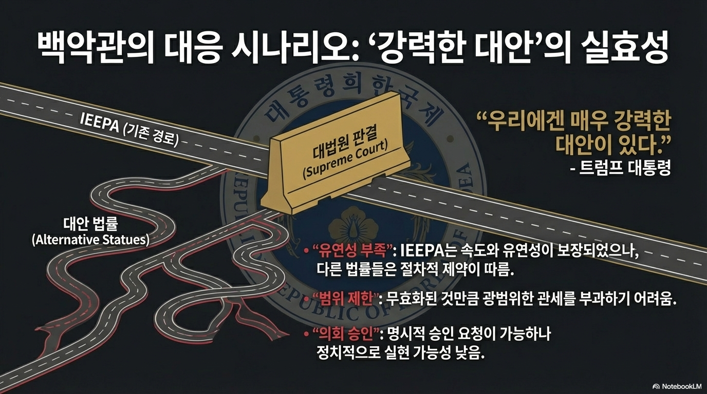 법적 패배에도 불구하고 트럼프 대통령은 물러서지 않고 있습니다. 그는 행정절차법상의 제약이 적은 "매우 강력한 대안적 법적 권한"이 있다며 관세 정책을 강행하겠다는 의지를 보였습니다. 비록 가장 강력한 무기였던 IEEPA는 잃었지만, 다른 법률을 동원한 우회 전략을 예고함에 따라 글로벌 무역 질서의 불안정성은 당분간 지속될 전망입니다.