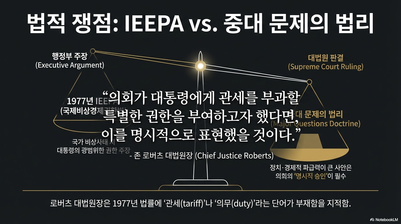 이번 판결의 법적 쟁점은 1977년 제정된 '국제비상경제권한법(IEEPA)'의 해석에 있었습니다. 트럼프 행정부는 이 법이 대통령에게 비상시 관세를 부과할 포괄적 권한을 묵시적으로 부여했다고 주장해왔습니다. 그러나 대법원은 IEEPA 법전 어디에도 '관세(tariff)' 혹은 '관세금(duty)'이라는 단어가 명시되지 않았다는 점을 지적하며, 이를 근거로 한 대규모 관세 행정은 권한 남용이라고 판시했습니다.
