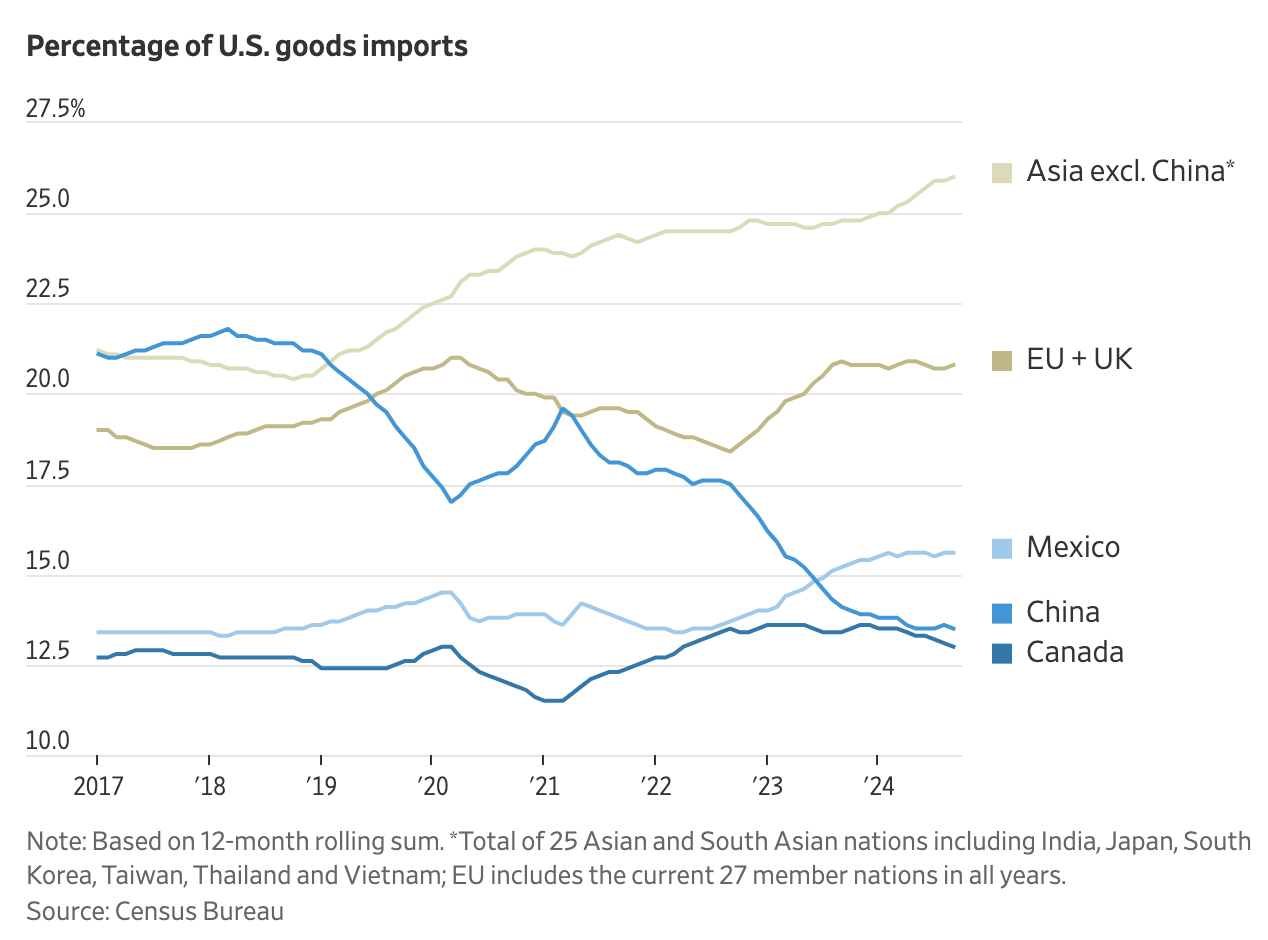 특히, 멕시코와 캐나다는 북미 지역에서 가장 중요한 무역 파트너로, USMCA(미국-멕시코-캐나다 협정)를 기반으로 긴밀한 경제 관계를 유지하고 있습니다. 중국 또한 스마트폰, 기계류, 완구 등 미국 경제에서 필수적인 제품을 공급하는 주요 무역 파트너입니다. 이러한 국가들에 높은 관세를 부과하는 것은 단순히 무역 균형을 조정하려는 목적을 넘어, 미국 소비자, 글로벌 공급망, 그리고 국제 무역 질서 전반에 걸쳐 상당한 영향을 미칠 수 있습니다.