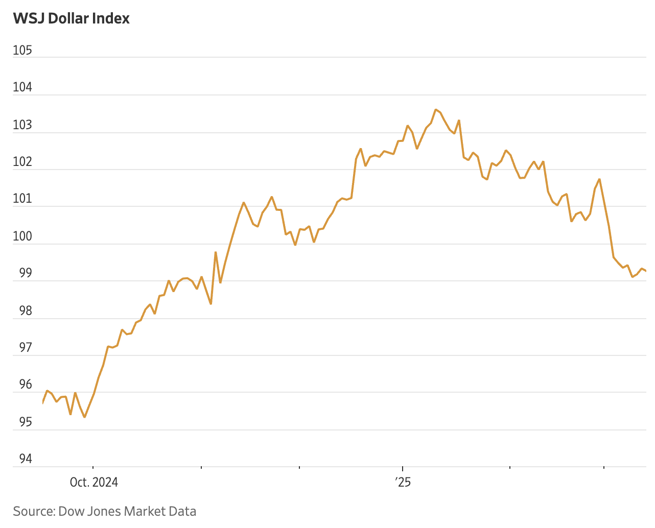최근 몇 주 동안 WSJ 달러 지수(WSJ Dollar Index)는 9주 중 7주 동안 하락하며, 11월 5일 선거 이후의 상승분을 거의 반납했습니다. 이러한 흐름은 미국 내 정책 변화와 글로벌 투자 흐름의 변화를 반영합니다.