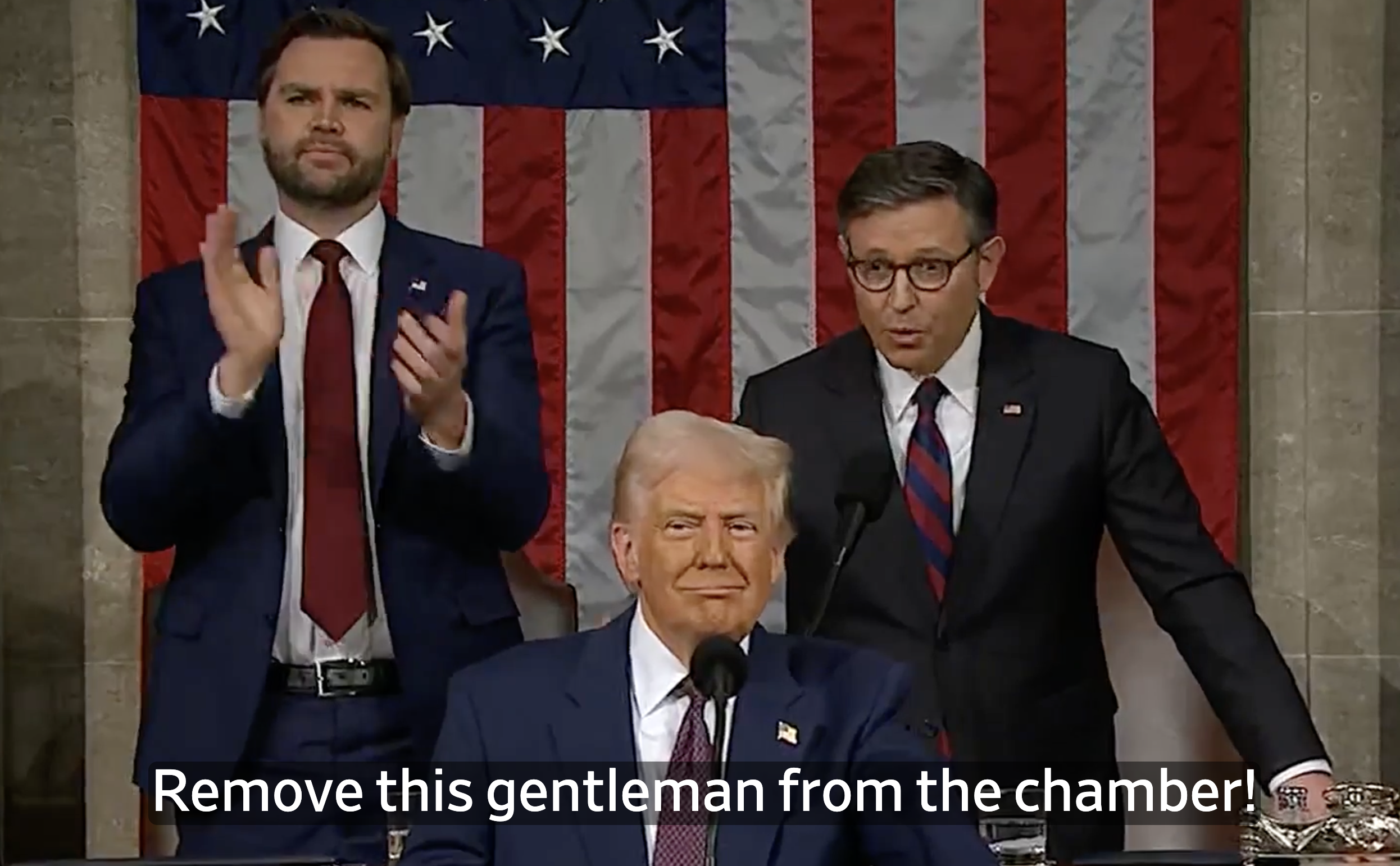 트럼프 대통령이 2024년 대선 결과를 "국민의 강력한 지지"라고 강조하며 연설을 이어가자, 일부 민주당 의원들은 즉각 반발했습니다. 특히, 텍사스 출신 알 그린 의원은 트럼프 대통령에게 소리를 지르며 지팡이를 흔들었고, 결국 의회 경호원들에 의해 강제로 퇴장되었습니다.