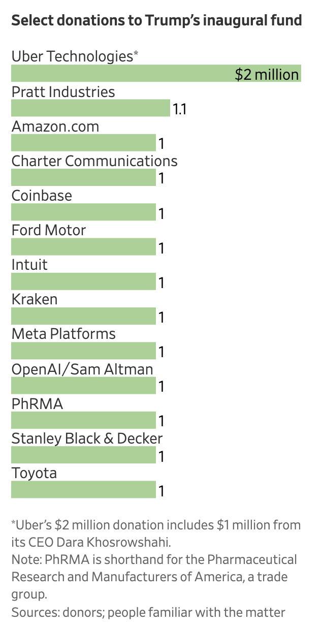 - 인튜이트(Intuit): 지난 두 번의 취임식에서는 기부하지 않았지만, 이번에는 세금 소프트웨어와 관련된 규제 완화를 기대하며 100만 달러 기부.