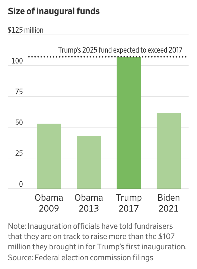 월스트리트저널(WSJ)의 보도에 따르면, 포드, 인튜이트(Intuit), 도요타, 제약연구제조업협회(PhRMA) 등 여러 대기업과 무역 단체가 트럼프 취임식 기금으로 각각 100만 달러를 기부했습니다. 트럼프의 첫 번째 취임식 때보다 더 많은 기업들이 100만 달러 이상을 후원하고 있으며, 이번 취임식이 역사상 가장 큰 규모의 기금 모금을 기록할 것으로 보입니다.