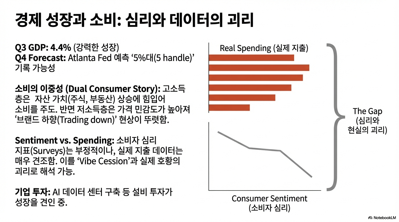 그는 이 현상에 미묘한 차이가 있음을 덧붙였습니다. 저소득층 소비자들은 절약하며 '더 저렴한 상품으로 갈아타는(trading down)' 경향을 보이는 반면, 자산 가치 상승의 혜택을 본 고소득층 가구가 전체 소비를 뒷받침하고 있습니다. 특히 그는 "부동산과 주식" 같은 자산을 보유한 가구의 자산 가치 상승이 소비 여력을 제공하고 있다고 구체적으로 설명했습니다. 이러한 단절은 자산 보유 가구에 대한 의존도가 높은 경제 상황을 시사하며, 그 성장의 폭과 지속 가능성에 대한 중요한 질문을 제기합니다.