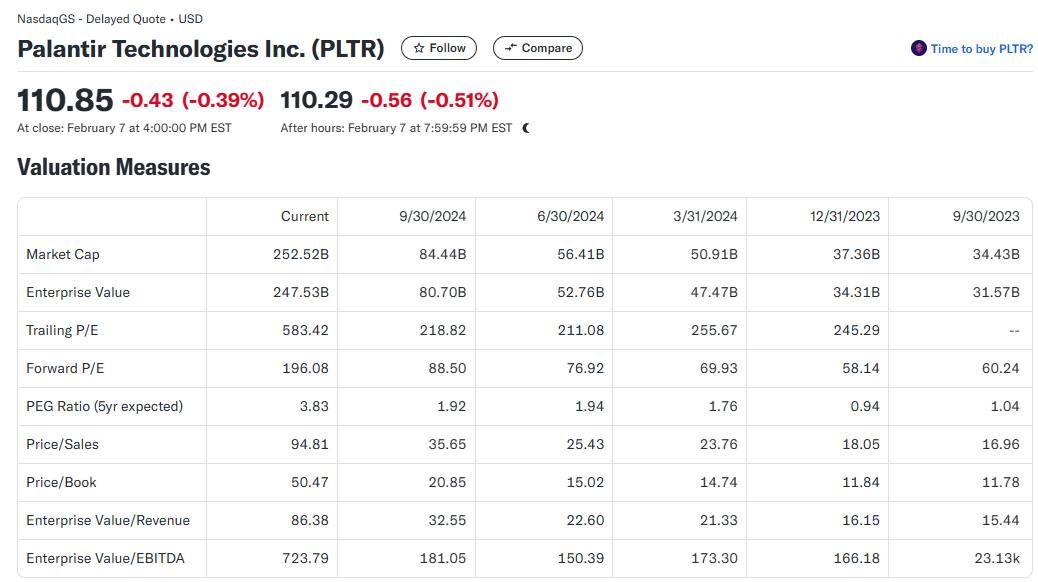 팔란티어의 주가수익비율(P/E)은 현재 585배로, 업계 평균 대비 극도로 높은 수준이다.